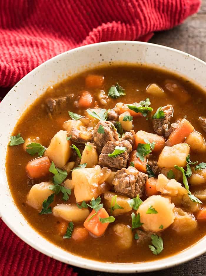 7. Mix together the cornstarch and cold water in a small bowl and stir into the stew until thickens.