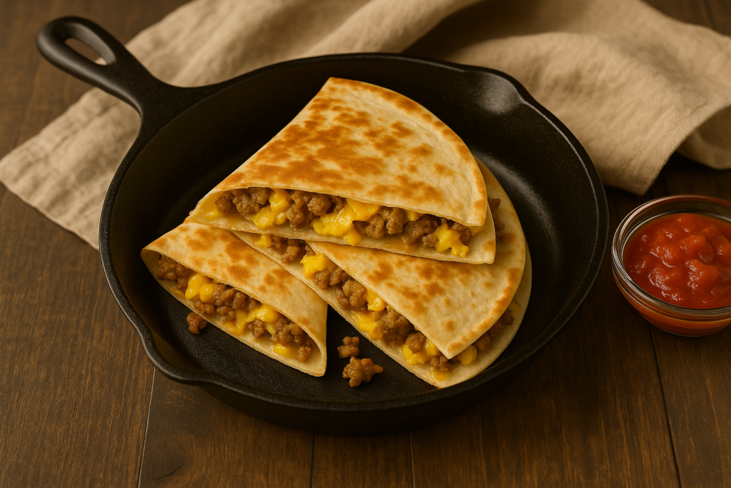 - Toast until golden. Cook 2–3 minutes per side until tortilla is crispy and cheese is melted.
