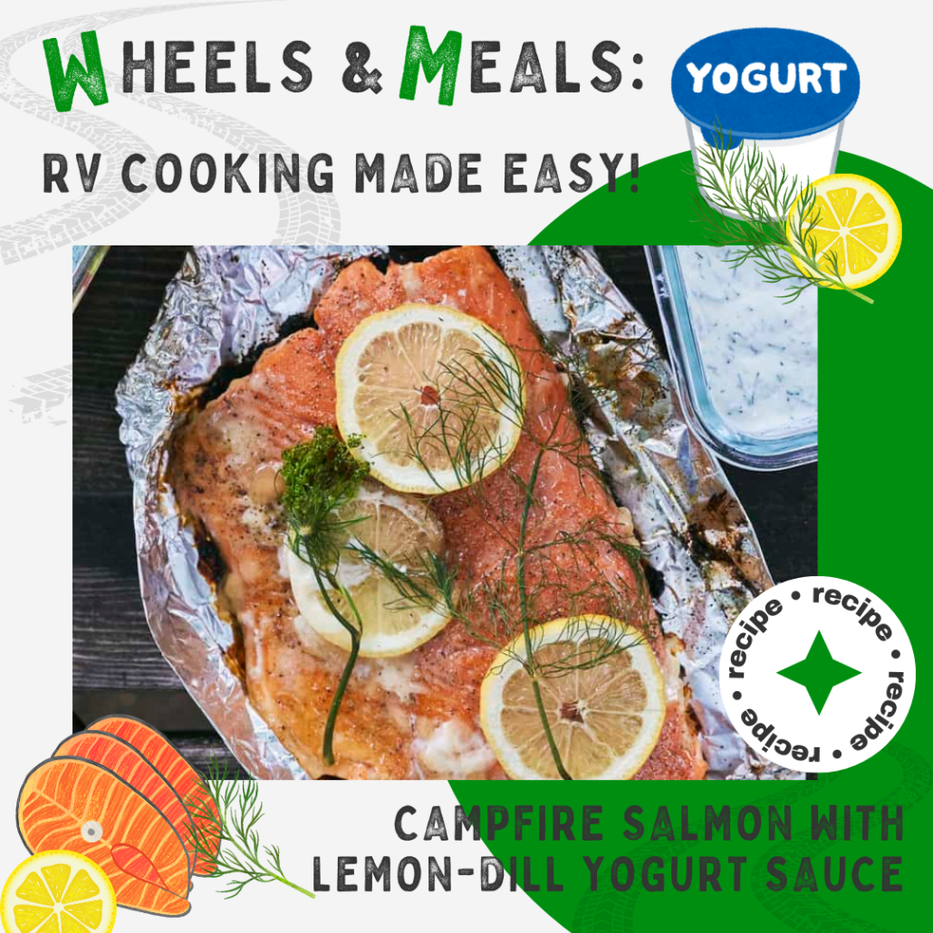 Cooking in the great outdoors is one of the joys of RV travel, and this campfire salmon with lemon-dill yogurt sauce is a must-try. Easy to prep ahead in your RV kitchen or at the campsite, it’s packed with flavor and perfect after a day of adventure. This simple, delicious dish will make your trip even more unforgettable!