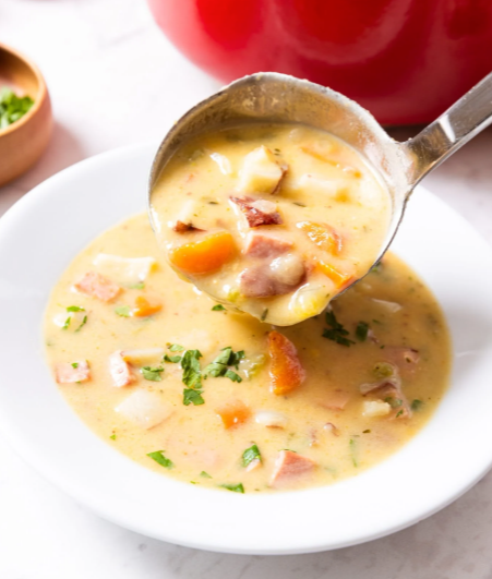 In a large pot or RV-friendly Dutch oven, melt butter over medium heat. Add onion, celery, and carrot. Cook 4–5 minutes until softened. Stir in garlic. - Add potatoes & ham: Add diced potatoes, ham, thyme, bay leaf, salt, and pepper.