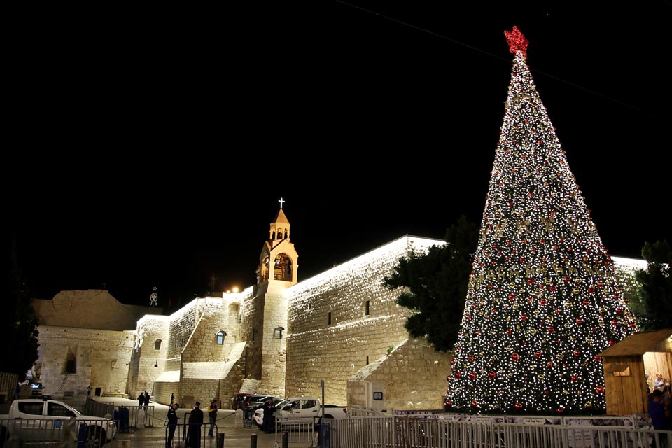 Selected photos from Manger Square in Bethlehem, the Cradle of Christ, showing the Church of the Nativity and the Christmas Tree on Christmas Eve for the Eastern sects, showing the details and walls of the adjacent houses, the balconies and the Omar Bin Mosque, the pendant lighting, and the beautiful decor. Around the place.