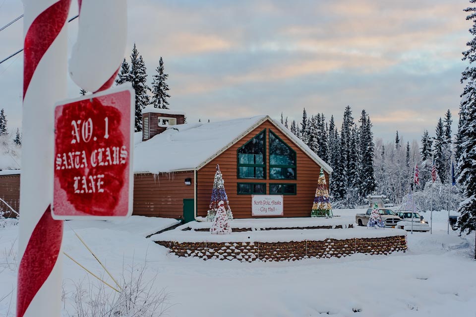 North Pole, Alaska,USA- Dec. 7, 2015: North Pole City Hall decorated in Christmas colors, North Pole, Alaska a town located 14 miles south east of Fairbanks maintains a christmas theme year round.