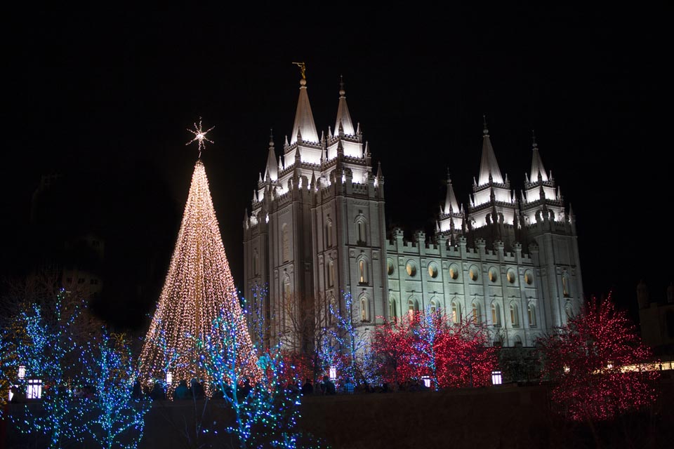 horizontal shot. Mormon Temple Christmas lights on Temple Square.