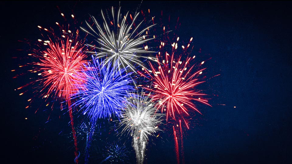 USA america united states new year or Independence Day celebration holiday background greeting card – Blue red white firework on dark night sky.