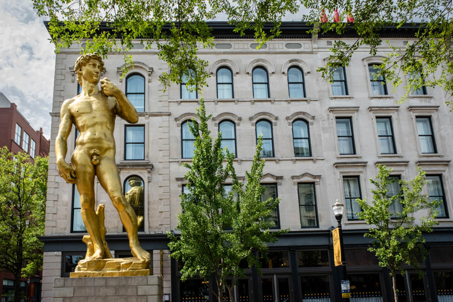 10. 21c Museum Hotel—You can find the most outstanding contemporary artwork throughout this unique hotel, and you know you’ve arrived when you see the enormous golden Michelangelo-inspired David statue out front along Main Street. Heading inside the boutique hotel, you’ll find multiple galleries of beautiful artwork, exhibitions and creative installations. By the way, check out their restrooms with fun two-way mirrors.