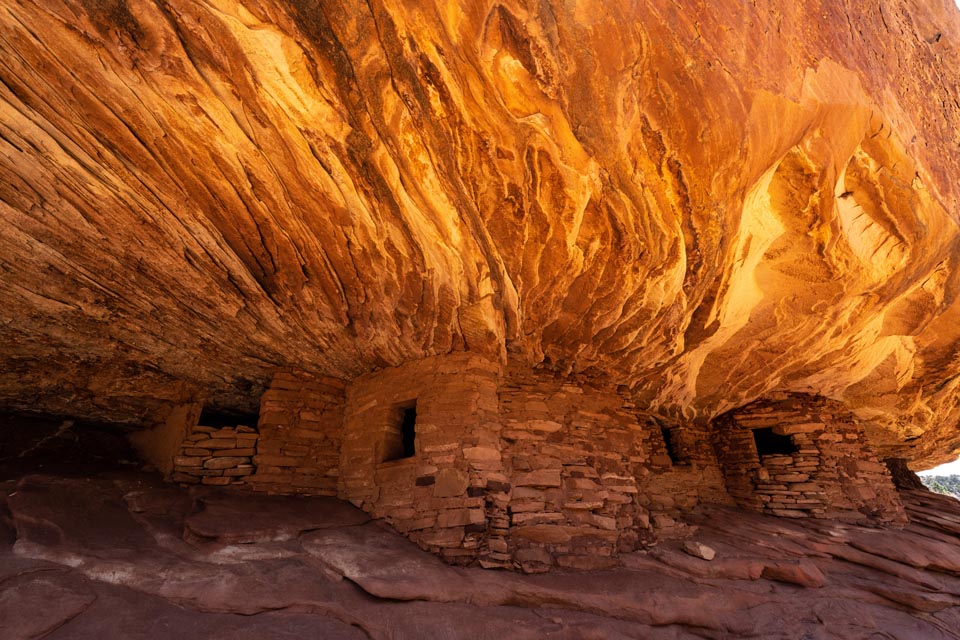 4. House on Fire—Those daring enough to venture up the Moki Dugway can continue the well-paved 261 across the top of Cedar Mesa to 95 East. Near Mile Marker 102, turn off onto Arch Canyon Road and find the trailhead for Mule Canyon. The entire Mule Canyon hike is a relatively flat 4.3 miles one-way, but most hikers hike just the first mile to see the House on Fire. This ancient Pueblo dwelling nestles in a crevice of red sandstone that appears to be on fire when the sun hits the rocks. Continue on the hike to see additional ancient sites.